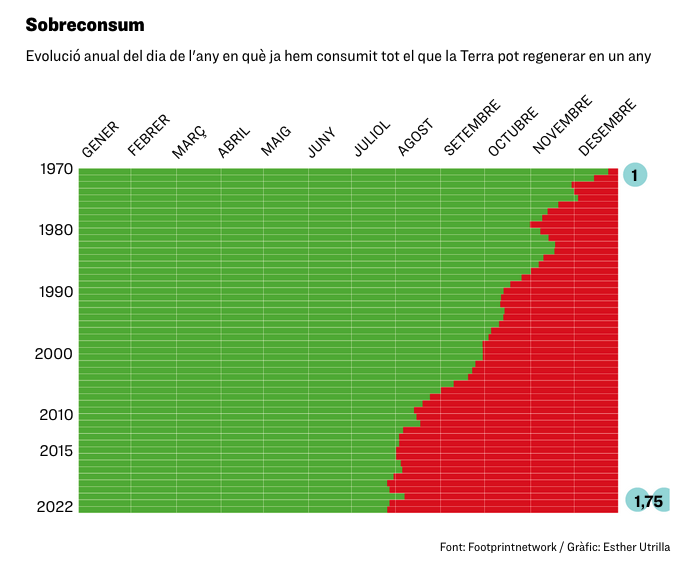 Cada any el món consumeix gairebé el doble dels recursos que la Terra pot regenerar en aquell any. Aquest 2022 no havien passat ni set mesos: el 28 de juliol, la població mundial ja havia consumit tot el que la natura pot proveir-li en un any (de manera sostenible). En aquest any que deixem enrere, a més, s’ha produït una fita històrica que sumarà pressió al dèficit ecològic que estem generant al planeta. El 15 de novembre va néixer l’habitant número 8.000 milions. Es diu Damián i és de la República Dominicana. Segons les dades de Global Footprint Network, l’empremta ecològica d’un dominicà és gairebé la meitat de la mitjana global. El Damián, és clar, no ens farà esgotar els recursos naturals. Però la xifra que representa aquesta petita criatureta en el còmput global d’habitants (i consumidors) mundials és un rècord demolidor, que planteja molts interrogants.