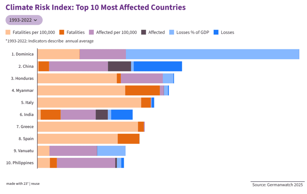 Mentre que països com la Xina, l’Índia i les Filipines s’han vist afectades per esdeveniments extrems recurrents, Dominica, Hondures, Myanmar i Vanuato han estat els més afectats per esdeveniments extrems excepcionals. Itàlia, Grècia i Espanya són els tres països europeus dins del top ten dels països del món més afectats les últimes tres dècades.